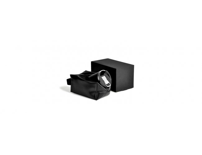 Kit necessaire e copo térmico. Composto por necessaire com alça em material sintético na cor preta e copo térmico com tampa e abridor de garrafa, confeccionado com dupla parede de inox, isolada a vácuo.