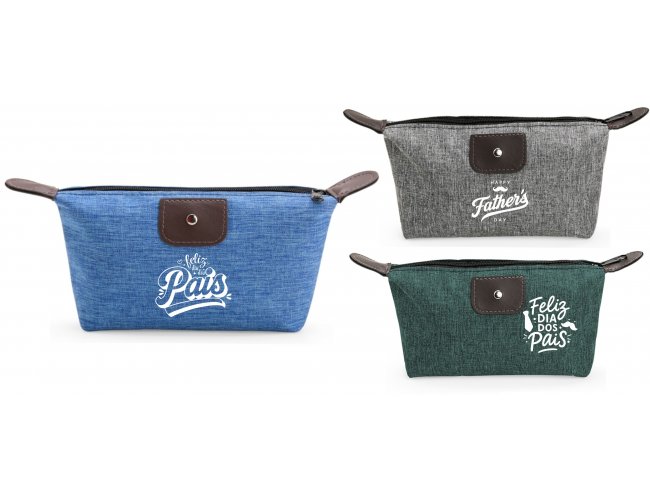Descrição: Nécessaire compacto confeccionado em Poliéster com mescla de PVC resistente à água, com fechamento em zíper e detalhes em bidim e metal.